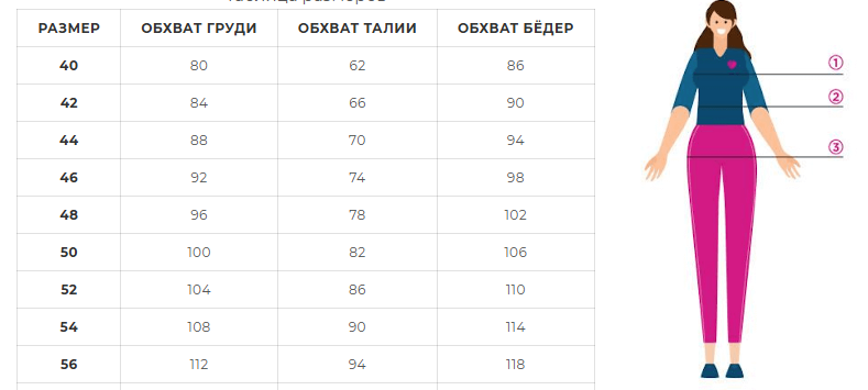 | Размер | Обхват груди | Обхват талии | Обхват бёдер |